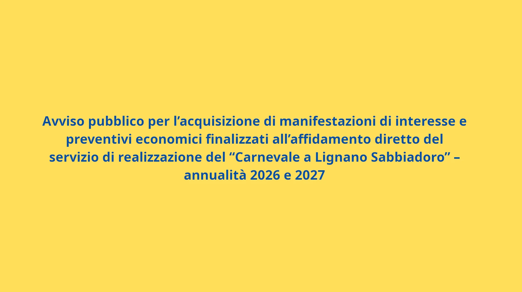 Il presente avviso pubblico finalizzato all’acquisizione di manifestazioni di interesse con contestuale presentazione di un preventivo economico, per l’affidamento diretto del servizio di realizzazione delle iniziative afferenti al “Carnevale a Lignano Sabbiadoro” per le annualità 2026 e 2027, ai sensi dell’art. 50, comma 1, lettera b), del D.Lgs. 36/2023. Il presente avviso ha natura esclusivamente esplorativa e non costituisce procedura di gara né determina l’instaurazione di posizioni giuridiche soggettive o obblighi negoziali in capo all’Amministrazione.